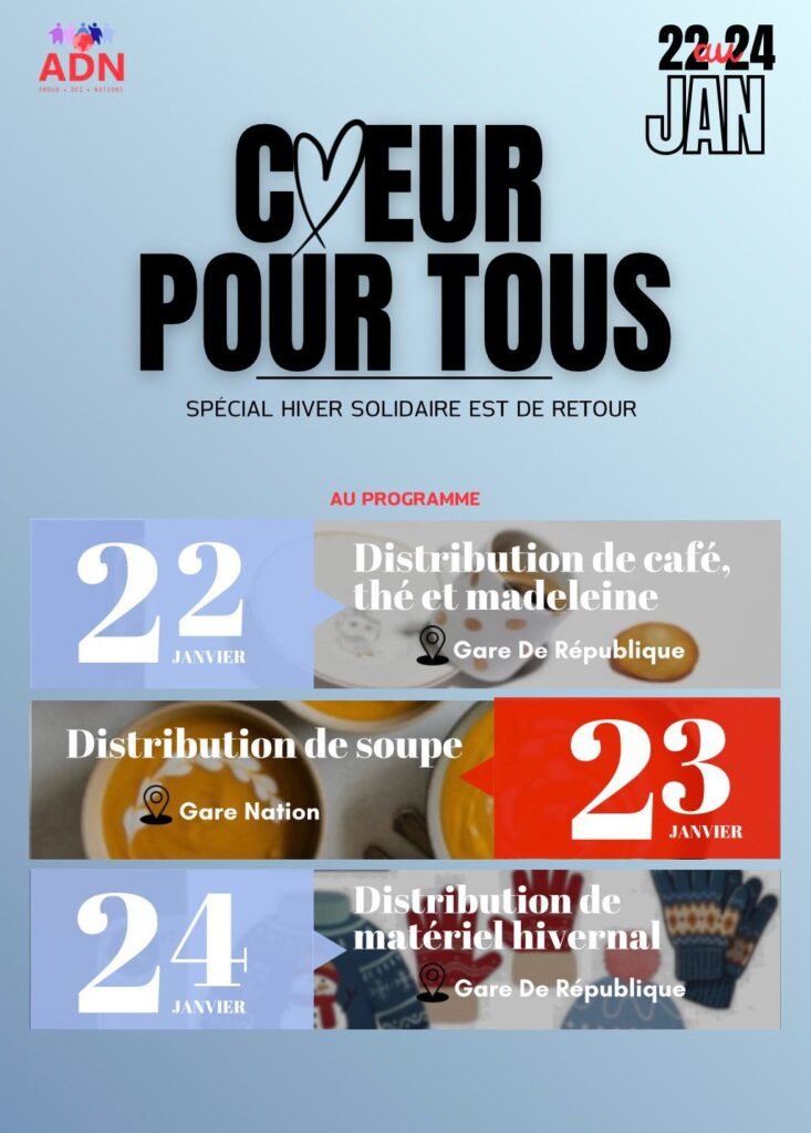 Evènements Coeur Pour tous Spécial Hiver solidaire l’occasion de pouvoir échanger et apporter du soutien aux dénumies . Gare de République / Gare de nation 22 & 24 Janvier 2026